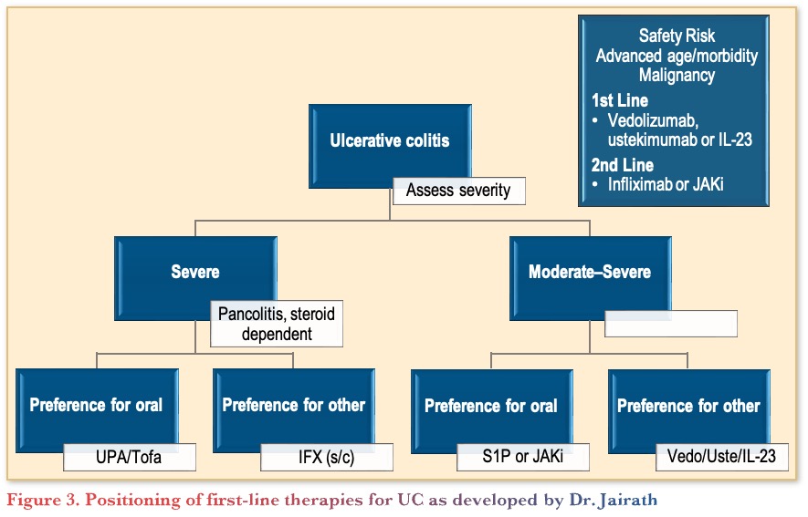 JAKi (tofacitinib and upadacitinib) have demonstrated the significant benefit of rapid response.15,16 In addition, post-hoc trial analyses have shown JAKi may be beneficial for fistulas in CD.17 JAKi should also be considered the as first-line treatment for EIMs given their multiple other indications, such as rheumatoid arthritis, psoriatic arthritis, atopic dermatitis, etc. Furthermore, the use of JAKi in ASUC is being explored.18