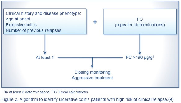 A 12-month prospective observational study of 70 patients with UC in endoscopic remission assessing the ability of fecal calprotectin and histologic inflammation to predict relapse found that baseline fecal calprotectin >321 mg/kg predicted disease relapse at 6 and 12 months.(7) Histologic inflammatory activity did not predict relapse, but patients with histologic inflammation had significantly higher fecal calprotectin levels than those without histologic evidence of inflammation. It may be appropriate to follow asymptomatic patients with elevated fecal calprotectin more frequently, as 2 elevated fecal calprotectin levels increase the risk of relapse.