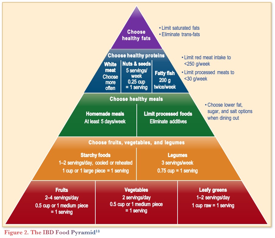 In terms of the guidelines, the 2024 AGA Practice Update on diet and nutritional therapies in IBD recommends all patients with IBD follow a Mediterranean diet (unless contraindicated).10 Figure 2 depicts the IBD Food Pyramid, a modification of the Mediterranean diet, that prioritizes food and food components that are mechanistically associated with better inflammatory responses in patients with IBD.