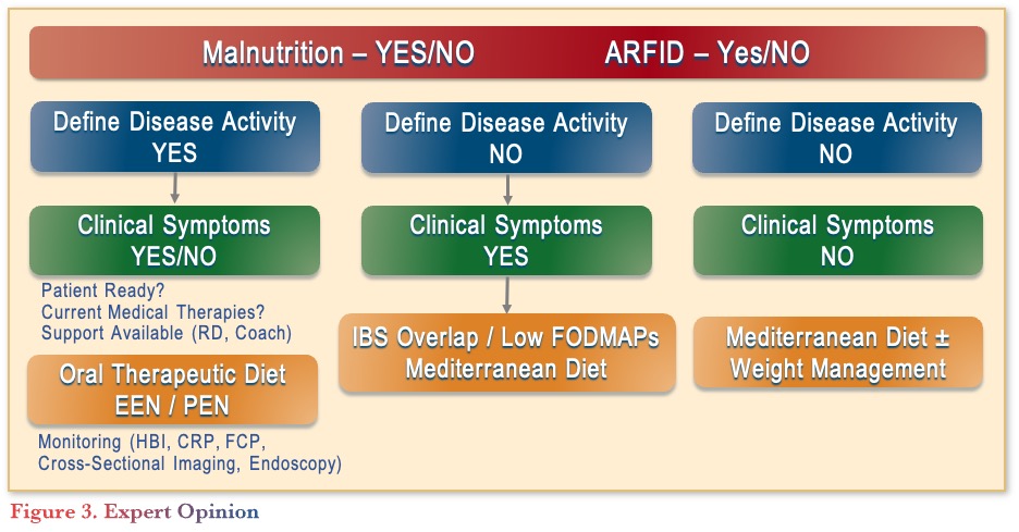 In conclusion, screening for malnutrition is an essential component of IBD care, as diet can play a critical role in IBD prevention and treatment. Prior to recommending any diets, patients should be screened for malnutrition or ARFID (avoidant restrictive food intake disorder) and have their disease activities defined with symptom characterization (see Figure 3). Depending on the disease activity and clinical symptoms, various diets can be recommended, considering patient readiness, medical therapies, and support systems. As future research evolves, there is potential for personalization of treatment through food DNA sequencing and AI.